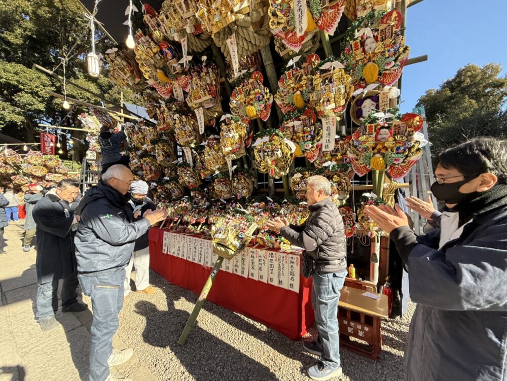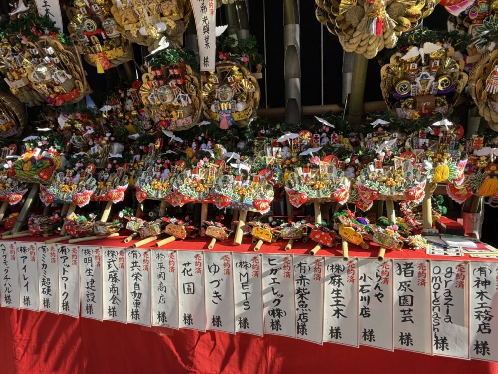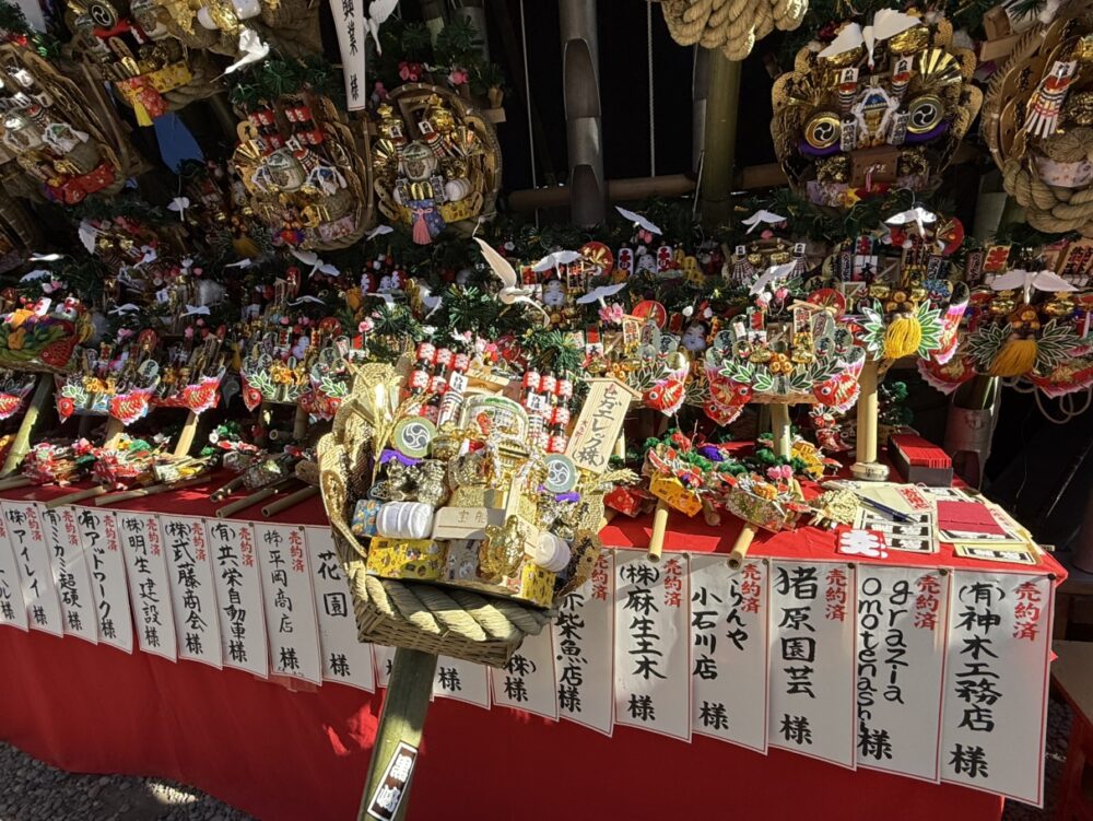 十日市(とおかまち)は、武蔵一宮氷川神社で行われる”大湯祭(だいとうさい)”に合わせて開催される熊手市です。